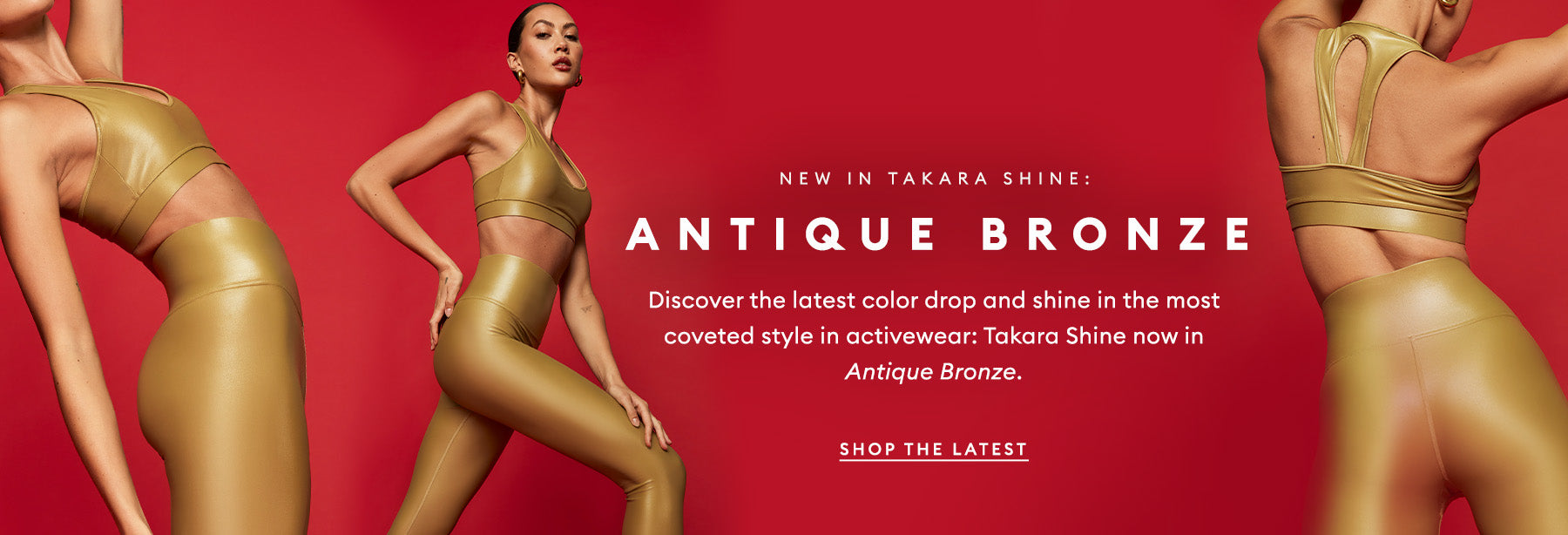 • Model styled in Action Bra in Takara Shine in Chocolate Torte with matching leggings, knit top tied at waist, yoga mat, and slides. Model wearing Action Bra in Takara Shine in Chocolate Torte, styled with matching leggings, against neutral backdrop.