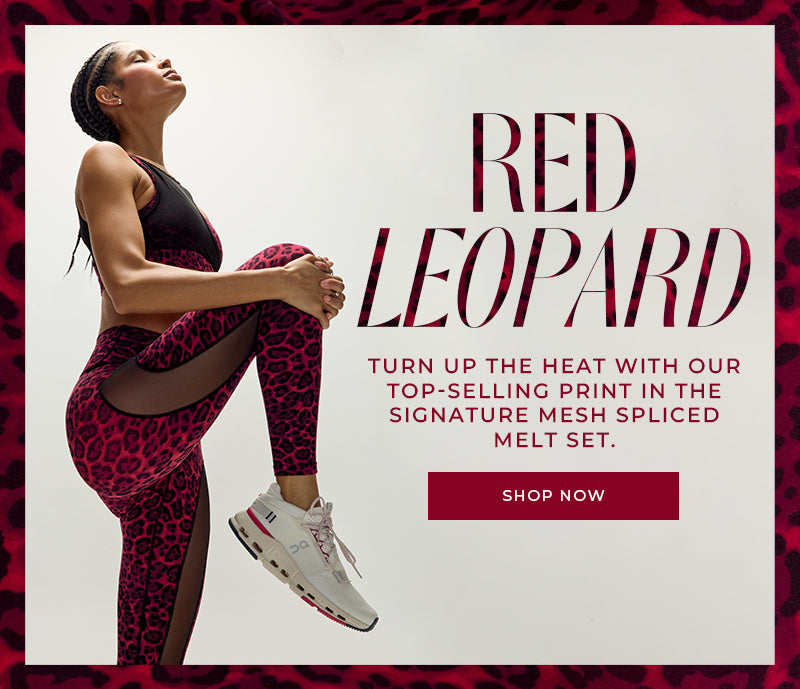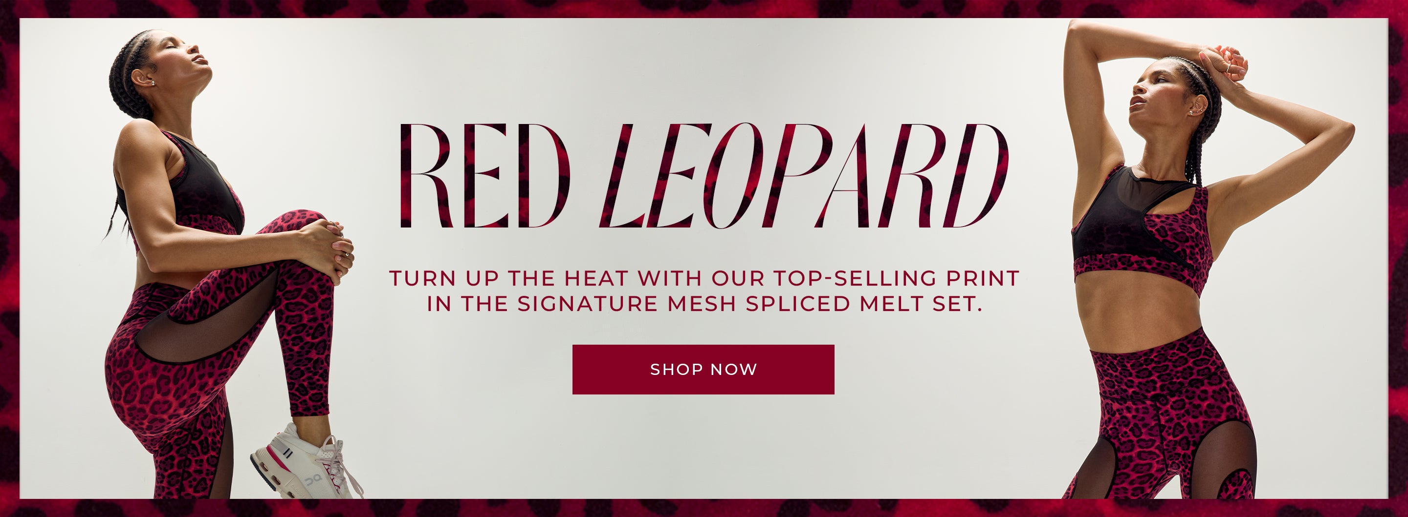 • Full outfit styled with Melt Square Neck Bra Leopard Print and leggings front view. Model wearing Melt Square Neck Bra Leopard Print cropped front view.