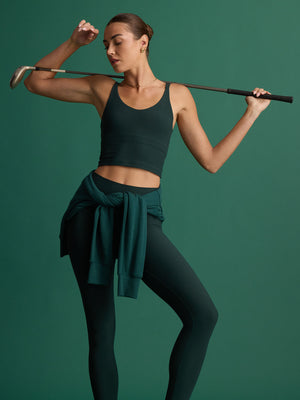 • Model is wearing the High Rise Legging in Forest, full body view. Model is wearing the High Rise Legging in Forest, front view.