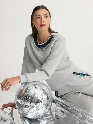 Model wears a grey, slouchy French terry sweatshirt with an off-the-shoulder, raw-edged asymmetrical neckline and a loose, relaxed fit.