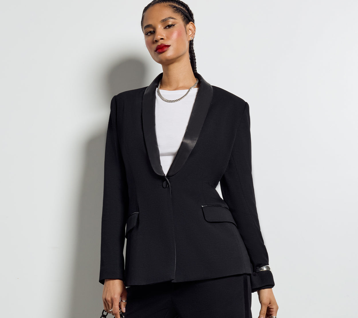Model is wearing the Tuxedo Blazer in black, front view with satin lapel detail.