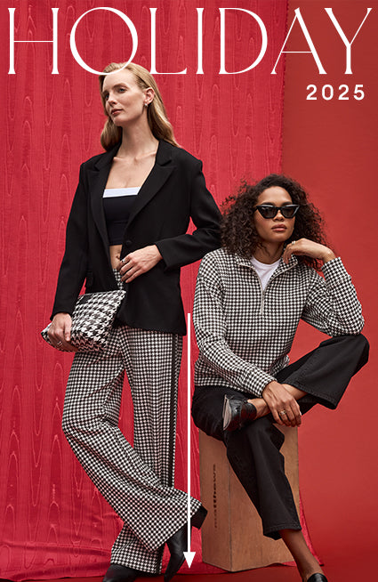 Full outfit view of houndstooth track pants styled with black ribbed top, oversized tote, and sneakers. Side view of houndstooth track pants with contrast side stripes and high-rise waistband.