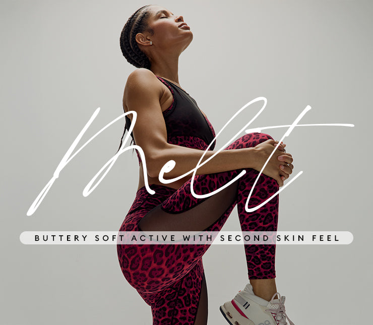 Full outfit view of Melt strappy tank and matching leggings in red leopard styled with navy sweatshirt and sneakers. Model wearing Melt strappy tank in red leopard, cropped square neckline front close-up.