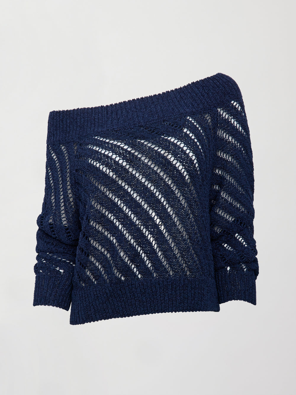 Model wears a navy off shoulder mesh cardigan with diagonal pattern.