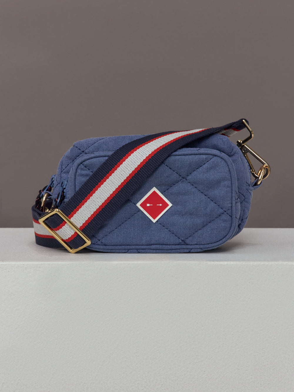 The Pacific Voyage Crossbody Bag in blue features a compact, structured design with a red, white, and blue adjustable strap.