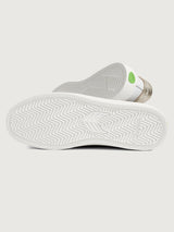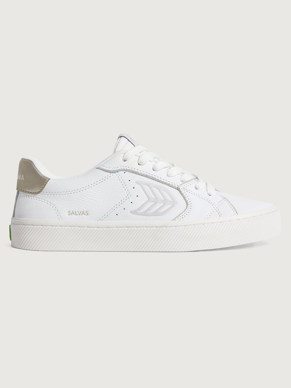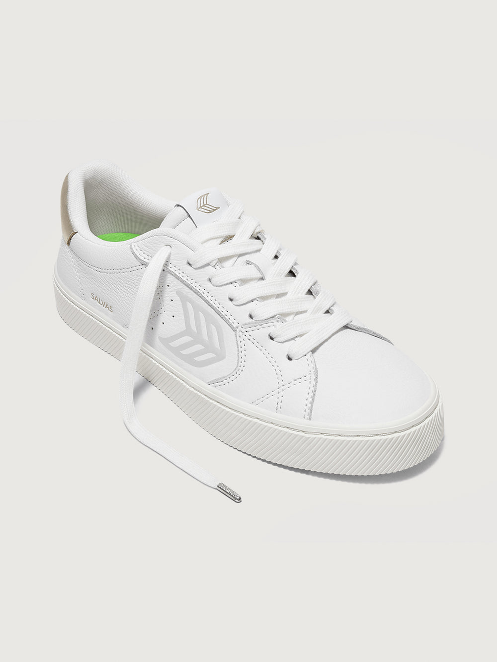 White sneaker with metallic gold heel and leaf logo on side.