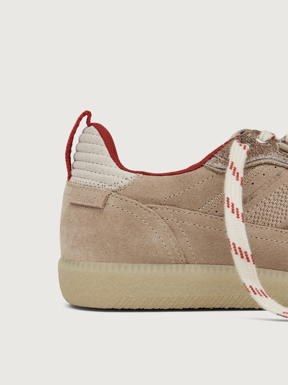 Gray/taupe low top lifestyle sneaker with red heel detail.