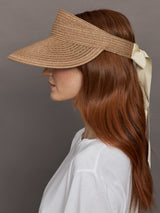 Model wears fawn-colored visor with a wide brim and an ivory ribbon tied at the back.